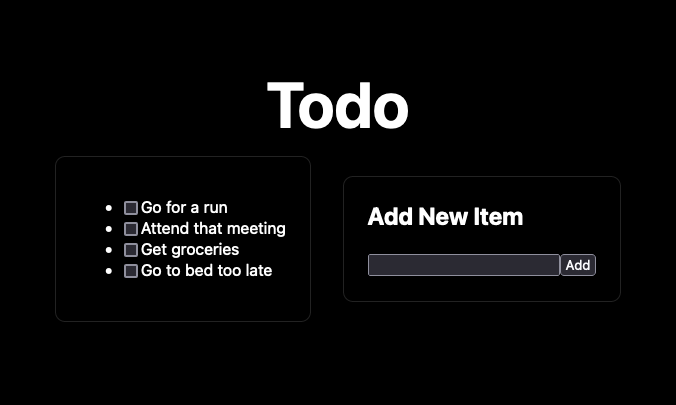 1 2 3 4 5 6 7 8 9 10 11 12 13 14 15 16 17 18 19 20 21 22 23 24 25 26 27 28 29 30 31 32 33 34 35 36 37 38 39 40 41 42 43 44 45 46 47 48 49 50 51 52 53 54 55 56 57 58 59 60 61 62 63 64 65 66 67 68 69 70 71 72 73 74 75 76 77 78 79 80 81 82 83 84// Import the page and head components as well as the default style sheet. import type { NextPage } from 'next' import Head from 'next/head' import styles from '../styles/Home.module.css' // Import the React module for handling state variables. import { useState } from 'react' // Create the page, using the NextPage type. const Todo: NextPage = () => { // Initialize the state variables and their set functions. // This example uses a static initial todo list, but you could instead have // the application load the todo list from a database on page load using // the useEffect module from React. const [todoList, setTodoList] = useState([ 'Go for a run', 'Attend that meeting', 'Get groceries', 'Go to bed too late' ]) const [newTodoItem, setNewTodoItem] = useState('') // Provide a function to add a new item to the todo list. const addTodoItem: void = () => { // Create a new version of the list with the new item added, then set the // todo list state variable to the new list. const newTodoList = todoList.concat(newTodoItem) setTodoList(newTodoList) } // Provide a function to mark a todo item completed, removing the item from // the list. const markTodoItem: void = (markedItem, isMarked) => { // Make sure that the user has marked the item for removal. if (isMarked) { // Create a new version of the list filtering out the marked item, then // set the todo list state variable to the new list. const newTodoList = todoList.filter(e => e !== markedItem) setTodoList(newTodoList) } } // Define the page's HTML structure. This includes a mapping function to // loop through the todo list items and create an li element for each with // the todo item text and a checkbox for marking it complete. return ( <div className={styles.container}> <Head> <title>Example Next App | Todo List</title> <meta name="description" content="Generated by create next app" /> <link rel="icon" href="/favicon.ico" /> </Head> <main className={styles.main}> <h1 className={styles.title}> Todo </h1> <div className={styles.grid}> <div className={styles.card}> <ul> {todoList.map((todoItem) => ( <li key={todoItem}> <input type="checkbox" onChange={ (e) => markTodoItem(todoItem, e.target.checked) } /> <span>{todoItem}</span> </li> ))} </ul> </div> <div className={styles.card}> <h2>Add New Item</h2> <p> <input type="text" onChange={ (e) => { setNewTodoItem(e.target.value) } } /> <button onClick={addTodoItem}>Add</button> </p> </div> </div> </main> </div> ) } // Export the page for processing and display. export default Todo